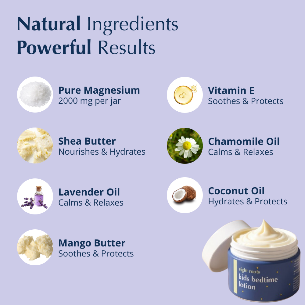 Lavender and chamomile oils are clinically linked to deeper, uninterrupted sleep. They work with magnesium to reduce nighttime restlessness, helping your child stay asleep longer.
